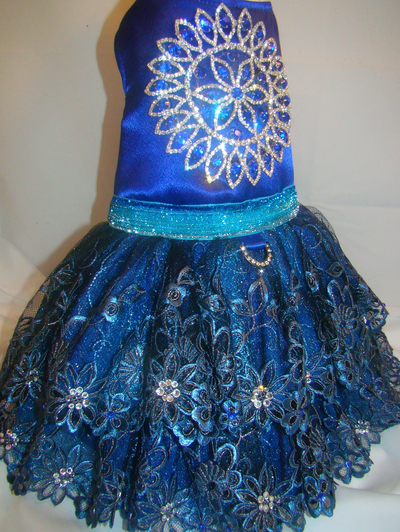 This stunning portrait dress is appropriately named STAR SAPPHIRE, OCEAN OF DREAMS. Made of lovely deep blue bridal satin, it is fully lined and interfaced to keep the shape. The upper body has a lovely rrhinestone STARBURST in blue and clear stones. The skirt is a double ruffle of lovely embroidery tulle and each ruffle has two underskirts. These ruffles are sewn on a fully lined skirt made of the same deep blue bridal satin as the top. Under that skirt is no less then SIX underskirts in tulles, lace, and organdy to maintain the fluff in the skirt. The double skirts have 60 clear Crystals on each ruffle. The waist line has a lovely multi colored shimmering waistband of velvet ribbon and there is a lovely rhinestone D-ring so you CAN WALK your fur baby in style! Velcro neck and underbody attachment. 3 inch length under the body, neck has a velcro that is 2.5 inches in length, making this dress adjustable to larger sizes. It measures fully closed at 10 inches in the neck, chest is 14 inches and the lenght is 15 inches. This IS a ONE of a KIND Portrait dress. It is signed and dated. If you are interested in ordering a custom portrait dress to FIT YOUR dog, please contact me thru Etsy.