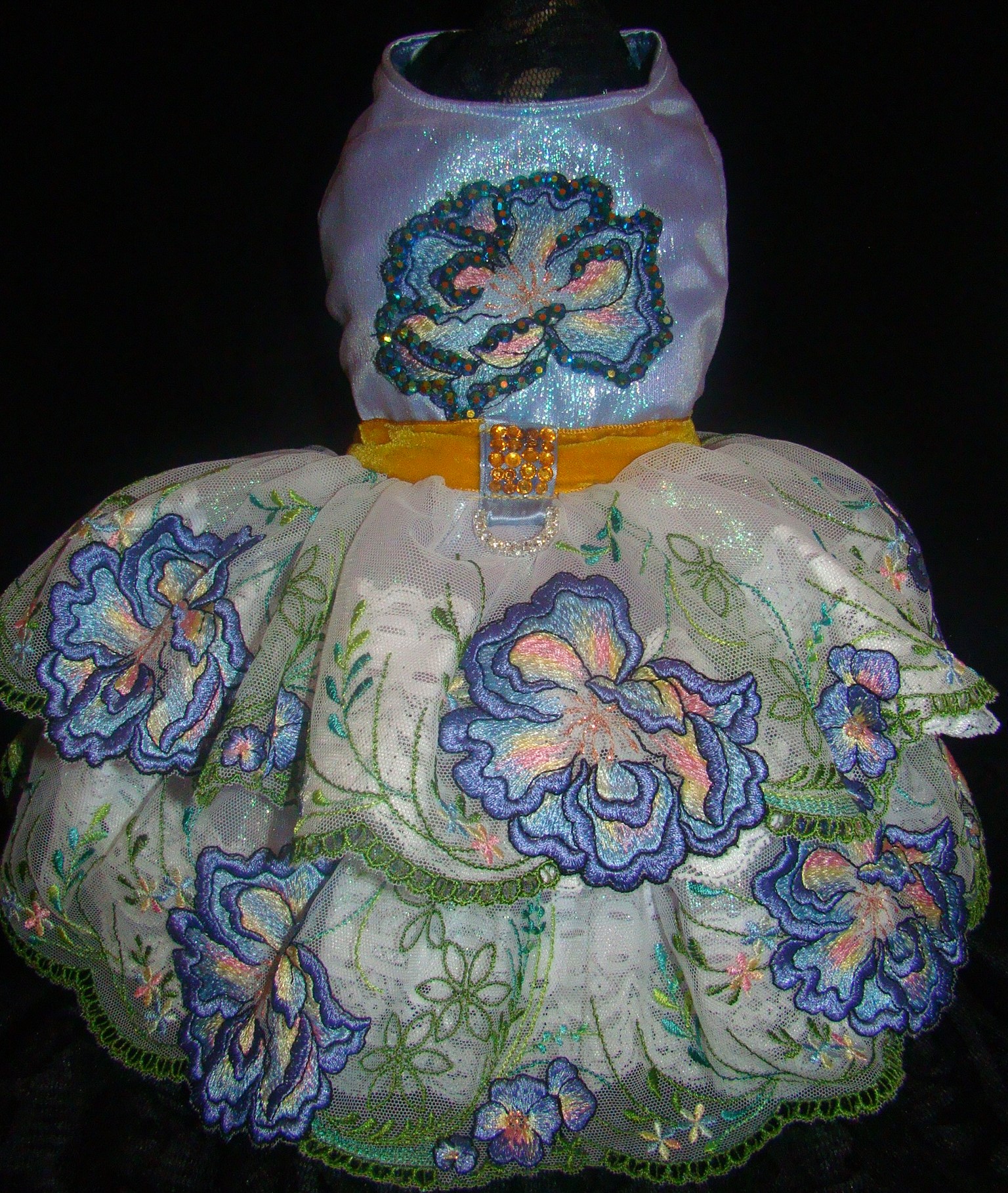 The Blue Rose Portrait Harness Dress is created with two shades of blue satin this beauty is eye pooping. The top is lined, interfaced, and has an opal sheen fabric over the deeper blue satin to give it a shimmering effect, making a total of four thin layers on top of the dress. I have appliqued one of the roses from the lace tulle skirt to the top and outlined it in deep blue/purple crystals. The waist is a gold velvet ribbon and a rhinestone D-ring that has gold crystals in the center. This dress has a double tier ruffle with many underlying layers. The vibrant color of this tulle lace alone will catch your eye and that lovely pattern is amazing. There are six shimmery underskirts in green, blue, pink and white. There is a fully lined satin skirt with double rows of ruffles also. Each row of ruffles has four skirts, making this dress fluff out and amazing. This dress is a size 11 inch neck, 11 inch chest, 12 inch length. For information on ordering one of my ONE OF A KIND dresses or harnesses, please contact me at [email protected] or message me on facebook or Etsy.