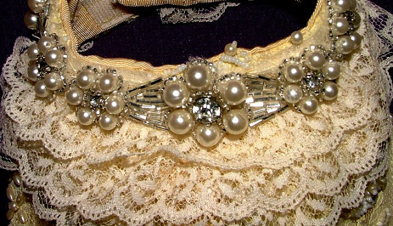 This exquisite piece was made from eye popping lovely vintage lace with sea pearls and beading. The bottom has tulle’ gathered and ivory lace on top of that but the more impressive part besides the pearl fabric is this OMGish lovely pearls and HUGE rhinestone trim on the neck overlaid on three rows of ivory lace. This trim came from a vintage coat and the rest came from a vintage formal dress. It is a size medium for the TOY Breed dog. It has heavy duty Velcro at the neck and at the chest and features a metal D-ring to connect a leash. It has a 14-15 inch chest, and a 12 inch neck. From back of the neck to the tail bone, it is 9 inches long, including the ruffles. The lining is Ivory taffeta so it is ultra soft next to the dog’s body.