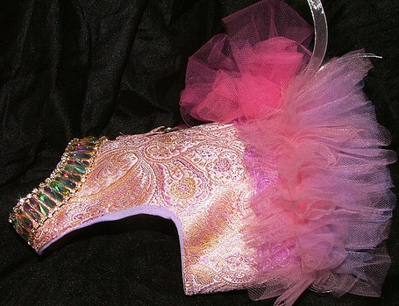 Beautiful and elegant, this brocade harness has a pink background with a soft swirl of lavender and gold paisley print. At the neck it has those incredible chain link pink rhinestones. The bottom has lavender re-embroidered lace trim and the very bottom has the pink and lavender tulle’ gathered up with the pink bow on top. It is a size X-small for the TOY Breed dog. It has heavy duty Velcro at the neck and at the chest and features a metal D-ring to connect a leash. It has a 13 inch chest, and a 10 inch neck. From back of the neck to the tail bone, it is 8 inches long. The lining is a light pink satin material so it is ultra soft next to the dog’s body. We pride ourselves on the workmanship of our products and guarantee quality. You will not find anything else on the market like it because it is a ONE OF A KIND and designed by Julie Lancaster of Off the Cuff Stuff for Pets. We ask that you measure your dog before you order from us because we do not offer returns on our clothing line due to health regulations. Make sure the measurements are ONE inch smaller than what is listed here. Please LIKE us on Face book where you will see our nearly daily listings of new items.