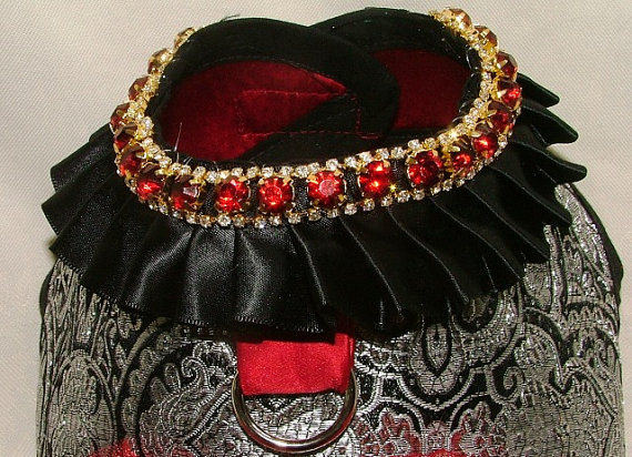 This elegant brocade harness has a black background and is overlaid in silver. The neck is a black satin pleated ruffle with a lovely red, gold and clear rhinestone trim sewn on top of it. The bottom has white, black, and red tulle’ gathered on the bottom of this vest and a big red bow in the middle with a red rhinestone jewel sewn in the center. It is a size medium for the TOY Breed dog. It has heavy duty Velcro closures at the neck and at the chest and features a metal D-ring to connect a leash. It has a 16-18 inch chest, and a 11.5 inch neck. From back of the neck to the tail bone, it is 8.5 inches long. The lining is a red satin material so it is ultra soft next to the dog’s body. We pride ourselves on the workmanship of our products and guarantee quality. You will not find anything else on the market like it because it is a ONE OF A KIND and designed by Julie Lancaster of Off the Cuff Stuff for Pets. We ask that you measure your dog before you order from us because we do not offer returns on our clothing line due to health regulations. Make sure the measurements are ONE inch smaller than what is listed here. Please LIKE us on Face book where you will see our nearly daily listings of new items.