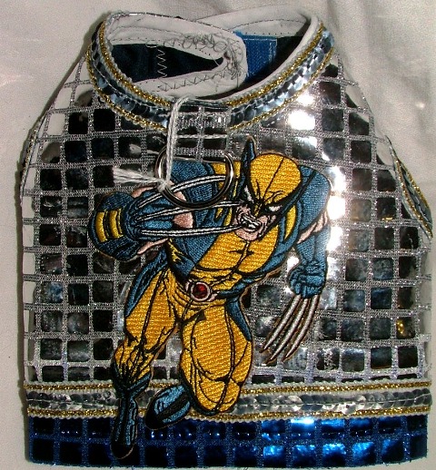 Here is the cool and unique Wolverine Dog Harness.The harness is made with mirror silver sequins fabric. The bottom has the blue mirror sequins and the neck and the lower waist has sequin sliver trim.It is fully lined with a dark blue satin. It is interfaced to keep the shape and is bound with white bias tape. The center has the Wolverine emblem and a metal D-ring tab where you connect the harness. There is super strong Velcro underneath the body and at the neck. This harness measures a size XSMALL toy breed dog. 13 inches in the chest and 9 inches in the neck.