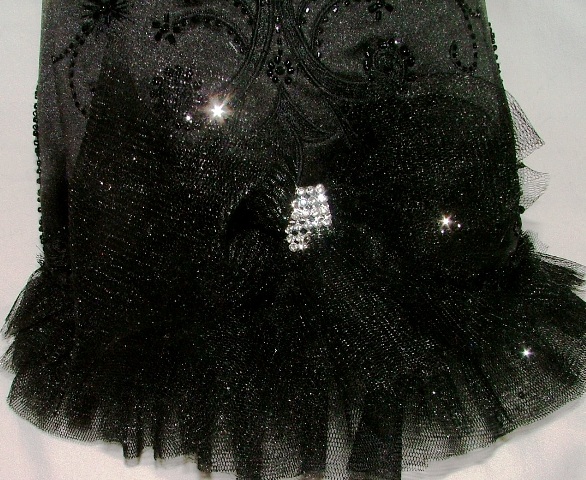 Total CLASS, here is Midnight. Made from a recycled bridesmaid demo gown that was never worn, this beauty is fully beaded, lined and interfaces. The neckline has those lovely marble and rhinestone trim. The bottom has four layers of shimmer tulle' with a bow and a lovely rhinestone mesh center. It is a size Med for the toy breed and available for purchase. Sorry folks, this is a ONE of KIND and cannot be duplicated. The chest measures 18 inches. It has a 12 inch neck and length is 12 inches.