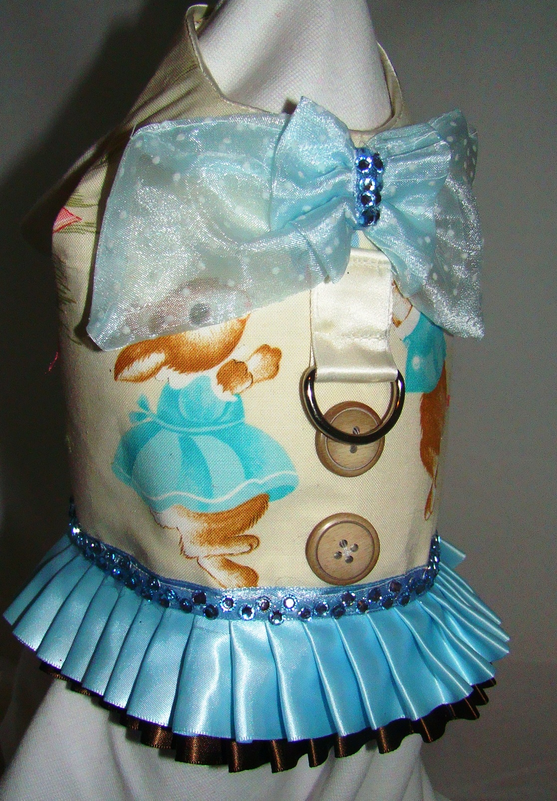 Adorable Bunny printed Harness Vest for the boy dog in your life. Cotton outside, Ivory satin inside for total comfort. Size 16 inch chest, 9.5 inch neck,7 inch length. This lovely harness vest has a double row of pleated satin ribbon, in baby blue and one in brown. Two wooden buttons on the front, powder blue crystals on the waist an in the center of the. The bow is made of shear dotted Swiss.