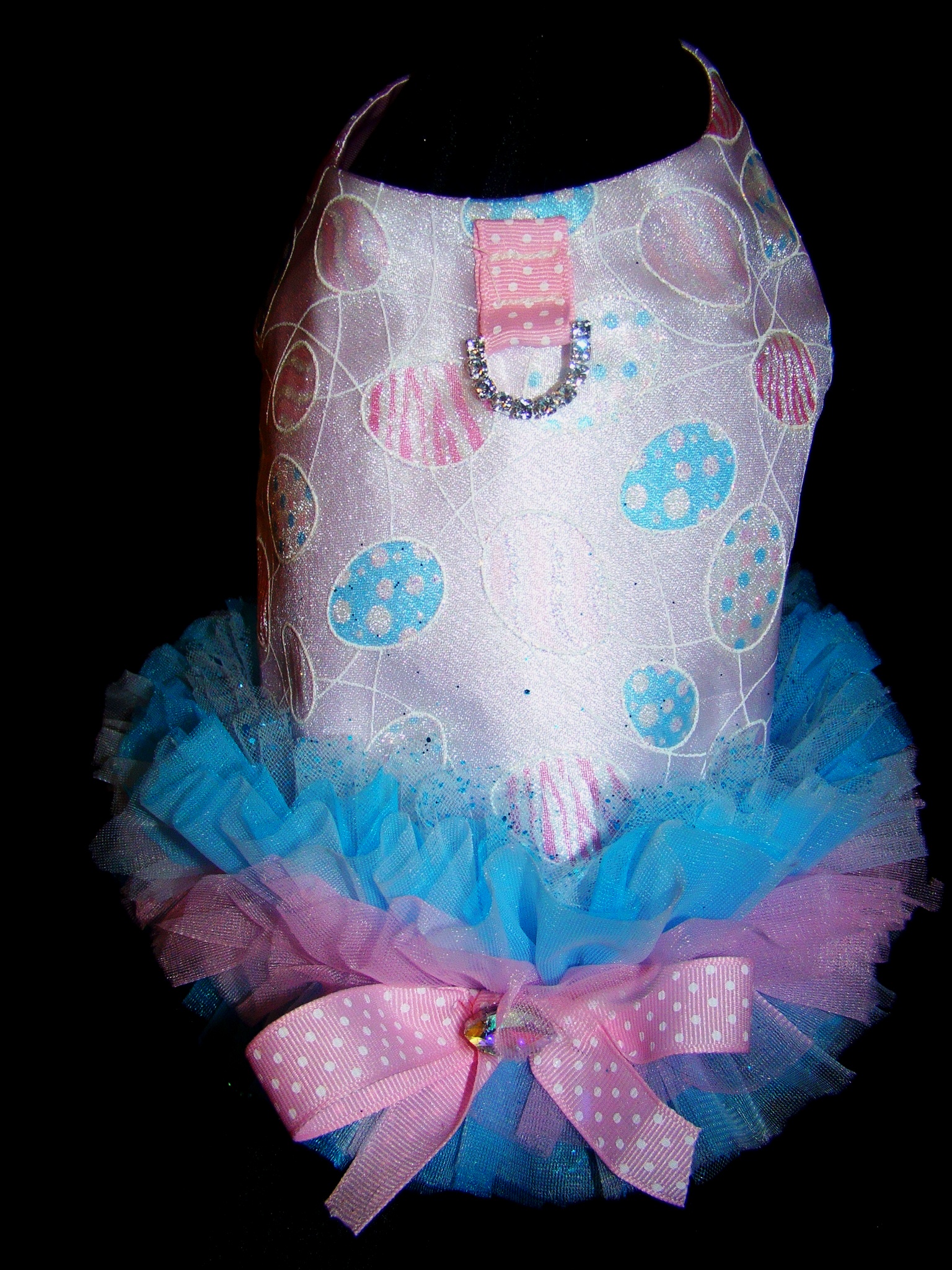Fully lined in pink, interface, and even interlined....introducing the Easter Day Harness!! This adorable piece has 8 ruffled tutus made of no-fray organdy, no-fray chiffons, and no-fray shimmer blue tulle. The bow is pink grosgrain ribbon with white polka dots adorned with a lovely multi-colored rhinestone in the center. The fabric is an organdy shimmer and EASTER EGGS and has a lovely rhinestone D-ring. Size X-Small. Neck: 11 in, Chest: 14 in, Length: 8in. Matching Easter Bonnet available for $20 by request!!