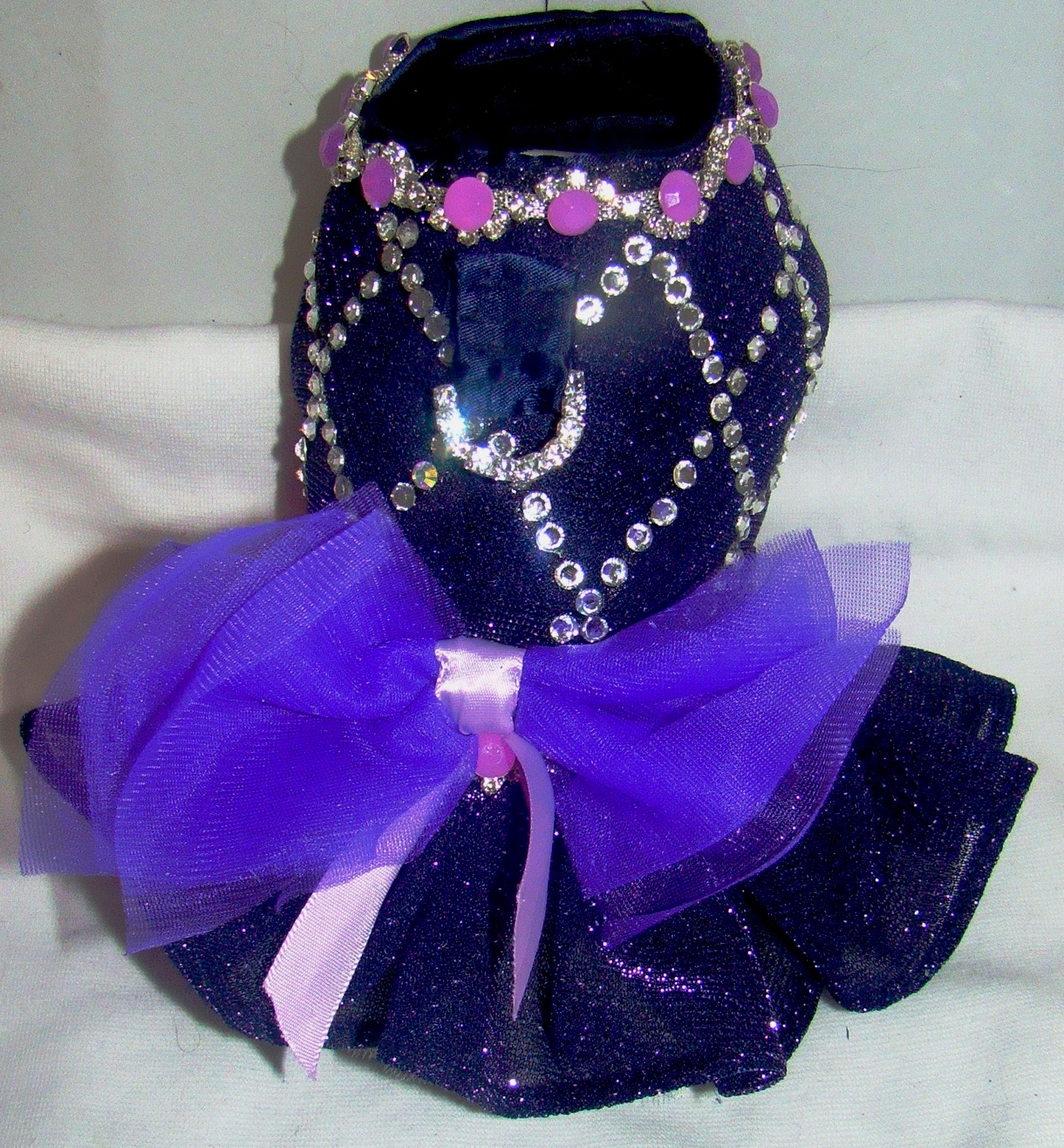 Another one from my Goth to Glam set... this one I call Purple PUNK. Very cute and girlie with its shimmery purple fabric, quilted bodice and beautiful silver crystal detail along the stitching. Fully lined, interlined and interfaced. The waist line is shades of purple and silver mesh rhinestone fabric with a lavender and rhinestone trim around the neck and lower waist. The skirt is the same material as the bodice with a mesh underskirt. Size XX-Small.