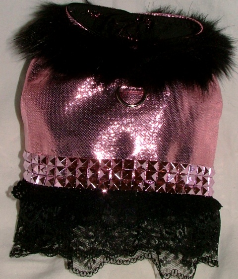 Pink Lame was used to make this adorable harness we call TWO SHADES of PINK. It has the black 2 inch fur at the neck and FOUR different layers of gathered black lace at the bottom. There is a three row shiny spike trim on the bottom. This adorable harness is designed for the female toy breed dog that has a I’m HOT attitude. It is measured in a size SMALL for the TOY Breed dog. It has heavy duty Velcro at the neck and at the chest and features a D-Ring loop so you can use it with your leash. It has a 14- 15 inch chest, and a 11 inch neck. From back of neck to tail bone, it is 7 inches long, including feathers. The inside is interfaced and fully lined in black satin fabric so it is ultra soft next to the dog’s body. We pride ourselves on the workmanship of our products and guarantee quality. You will not find anything else on the market like it because it is a ONE OF A KIND and designed by Julie Lancaster of Off the Cuff Stuff for Pets. We ask that you measure your dog before you order from us because we do not offer returns on our clothing line due to health regulations. Make sure the measurements are ONE inch smaller than what is listed here. Please LIKE us on Face book where you will see our nearly daily listings of new items.