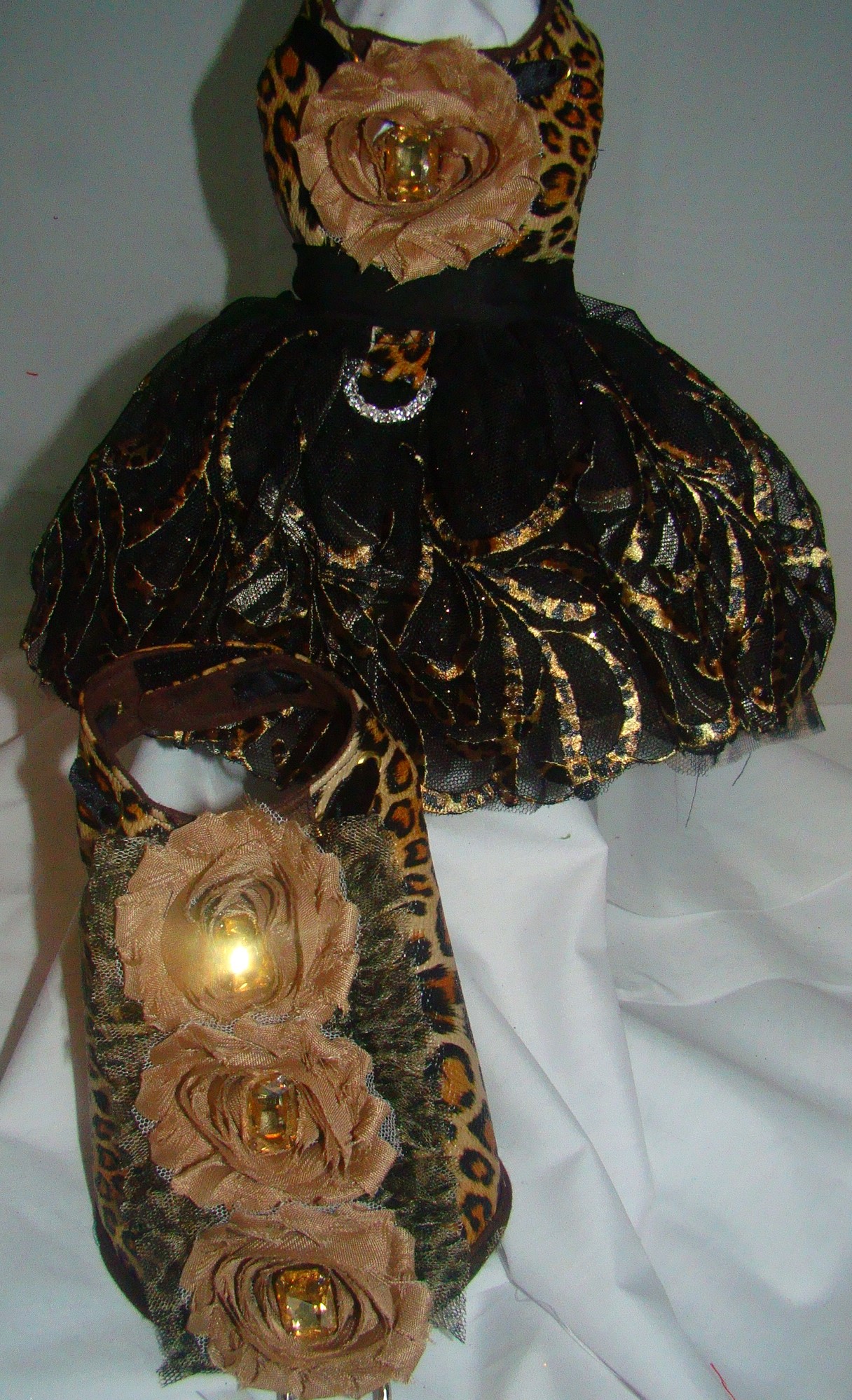 Made of faux leopard printed leather. The upper part of this top has rivets with black satin ribbon woven around the neck and a lovely ribbon rose on the center, accented with a topaz rhinestone in the center. The skirt has NINE skirts total made from shimmer tulles, leopard no fray chiffons, laces and that amazing lepord border printed tulle. There is a black satin waistband and a lovely rhinestone D-Ring. This dress is signed and dated. It is a size 7 inch neck, 10 inch chest and is 8 inches length. If you are interested in ordering a custom Portrait dress to FIT YOUR dog, please contact me via Etsy.