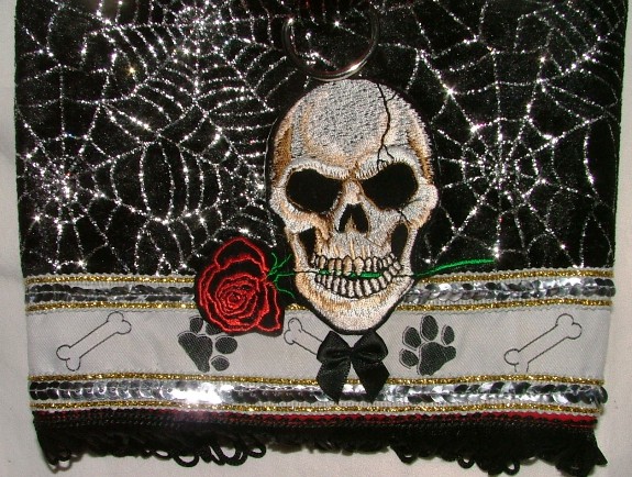 This bad boy is made from Cotton Velvet with a spider web print in raised silver. The neck has a pleated red satin ruffle, overlaid in a trim of silver and gold sequins with three black satin bows. The bottom half has a cool Goth appliqué with a skull holding a rose in its mouth. The very bottom has a row of ribbon with dog paws and bones. It has the same sequin trim on both sides of it and there is a sweet black bow in the center. It is lined with silver crushed velvet velour and has a black loop trim on the very bottom. T this vest is part of her BAD BOY series. It is measured in a size Large for the TOY Breed dog. It has heavy duty Velcro at the neck and at the chest. It has a D-Ring loop so you can use it with your leash. It is 17-19 inch chest has a 13 inch neck. From back on neck to tail bone, it is 9 inches long. The inside is interfaced and fully lines in navy blue cotton fabric so it is ultra soft next to the dogs body. We pride ourselves on the workmanship of our products and guarantee quality. You will not find anything else on the market like it because it is a ONE OF A KIND and designed by Julie Lancaster of Off the Cuff Stuff for Pets. We ask that you measure your dog before you order from us because we do not offer returns on our clothing line due to health regulations. Make sure the measurements are ONE inch smaller than what is listed here. Please LIKE us on Face book where you will see our nearly daily listings of new items.
