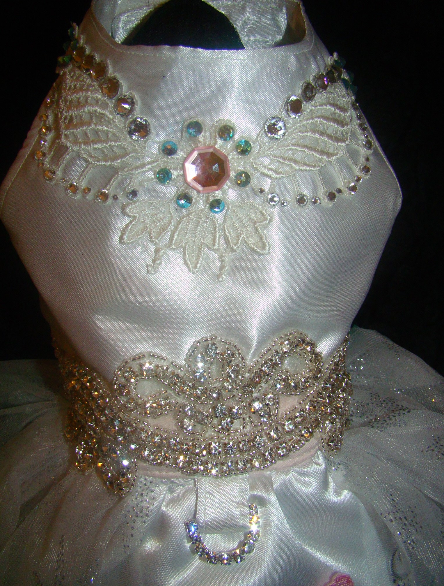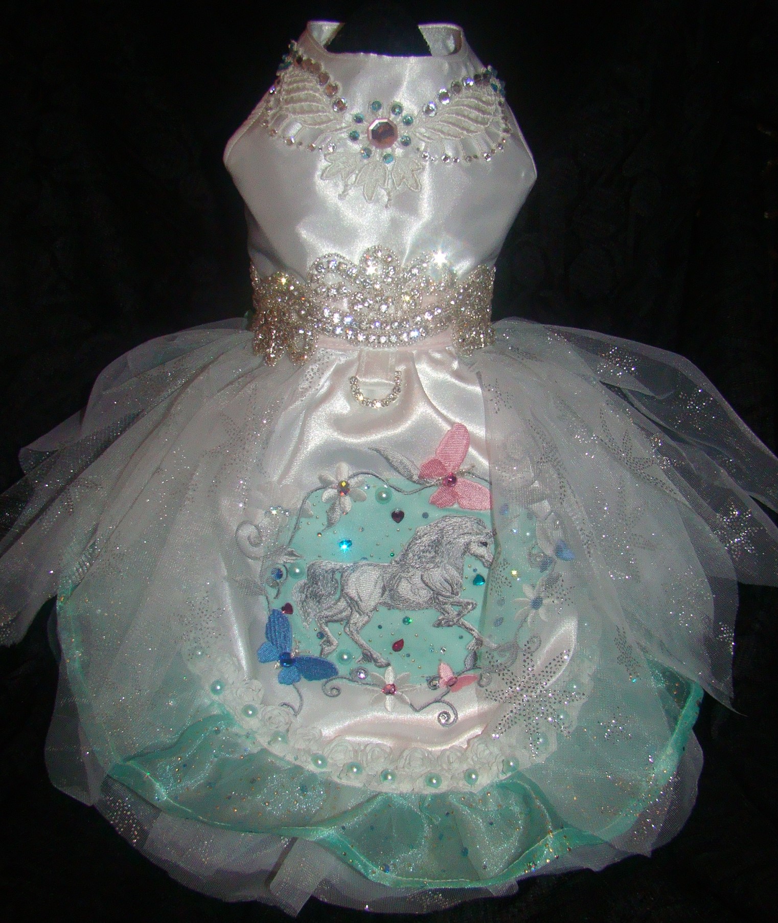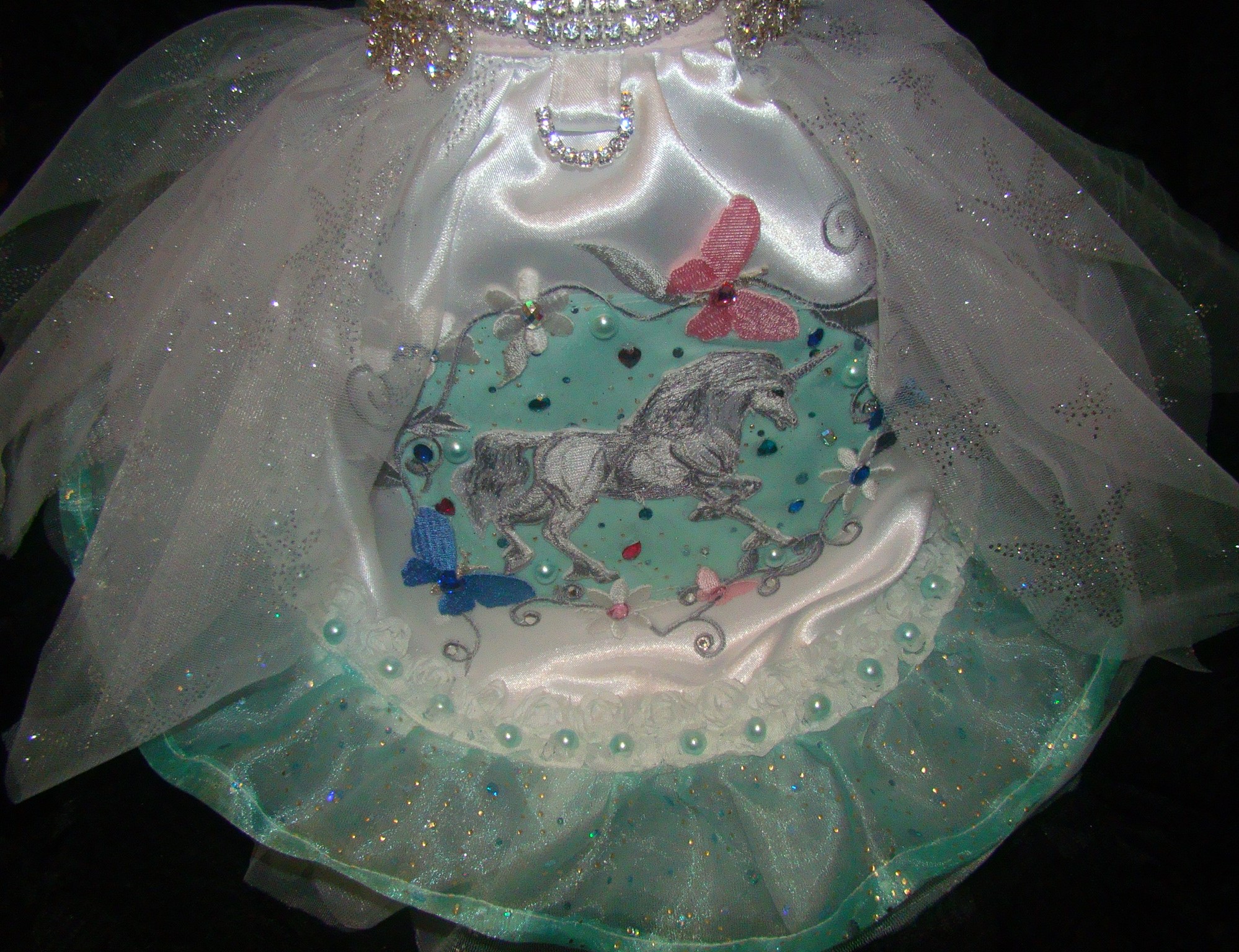 Described as gorgeous, fabulous and scrumptious on facebook, I must agree because all of my designs and dresses MUST have the UMP power! If it doesn't click, I have to work harder. This one has that true elegance and charm I work towards in my designs. It is made of white bridal satin, fully lined and interfaced. The top is decorated with a lovely snow white motif tatting lace and adorned in all sizes of Swarovski Crystals, including the large pink one in the center. The waist line is an amazing rhinestone 2 inch trim made of HIGH quality rhinestones. Finishing the look is a rhinestone D-ring so you can walk your dog in this dress. The skirt has seven under skirts of pink shimmer, white star shimmer, dotted white and silver shimmer tulle to keep the fluff. The main skirt is white satin that is also fully lined in white satin. It the center of the skirt is a soft teal satin overlaid in a multi colored sparkle tulle. It is surrounded by a chain of white flowers and butterfly applique that encircles the majestic unicorn in the center, also embroidery sewn high quality applique. I have enhanced this lovely unicorn and the background with lots of different shaped crystals and teal half pearls. I have applied tulles and lovely netting to the sides of the skirt in peddles of white shimmer tulle and silver star shimmer tulle. This is done only on the sides of the skirt to give it a frame for that lovely centerpiece.Tthe bottom of the skirt has a three layer petticoat of white no fray chiffon, silver star shimmer tulle and that lovely teal organdy covered in multi colored shimmer dots. I have also put a double row of baby teal chiffon rose trim and applied half pearl teal beads to it. . It is a size 11-12 neck-15-17 waist16-17 long. There is NO OTHER LIKE it.. It is a ONE OF A KIND and I will NOT be making any others. This whimsical dream Unicorn Princess Dress is perfect for your spoiled pooch and a dream of a lovely dress! If you are interested in ordering a custom made outfit please email me at [email protected] or message me on facebook or Etsy.