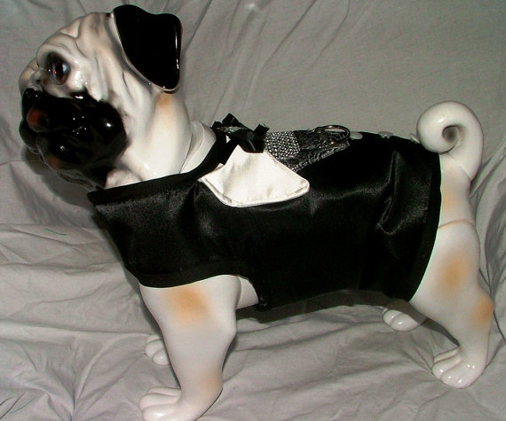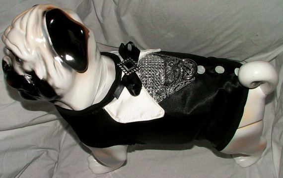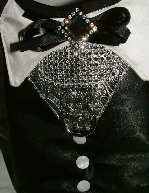 Perfect for the holiday season here is a TUX for your dog! It is made of black satin and has a sequined and mesh rhinestone lapel. It has a faux white collar that makes it look like there is a white shirt underneath and a black tie with a mirror trim in the center of it. There are three white buttons below the lapel. It measured in a size LARGE for the TOY Breed dog. It has heavy duty Velcro at the neck and at the chest and features a metal D-ring to connect a leash. It has an 18-19 inch chest, and a 15 inch neck. From back of the neck to the tail bone, it is 9 inches long. The lining is white satin so it is ultra soft next to the dog’s body. We pride ourselves on the workmanship of our products and guarantee quality. You will not find anything else on the market like it because it is a ONE OF A KIND and designed by Julie Lancaster of Off the Cuff Stuff for Pets. We ask that you measure your dog before you order from us because we do not offer returns on our clothing line due to health regulations. Make sure the measurements are ONE inch smaller than what is listed here. Please LIKE us on Face book where you will see our nearly daily listings of new items.