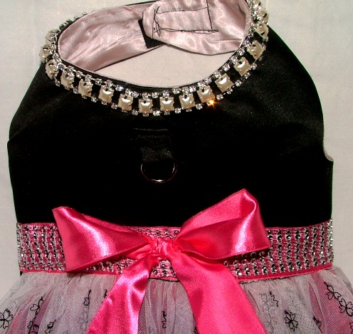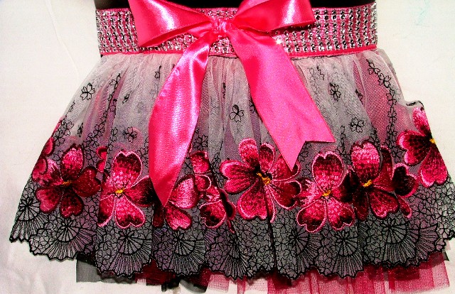 This lovely dress was designed using black velvet on the bodice, adding a lovely trim of pearls and rhinestones at the neck . The waist has a two inch wide PINK satin ribbon that is overlaid in rhinestone mesh sewn on it and has a very lovely PINK satin bow in the center. The skirt on this dress is amazing. It has five layers. The one on top is such a lovely embroidered design of big PINK and Burgundy flowers with black accents. The other layers are black, red, white chiffon and tulle’. The bodice is completely lined, and interfaced to keep its shape. This dress is remarkable and is what she calls a portrait dress but can be used for parties and more because like all of Julie’s outfits, she designs them with D-ring so you can keep your beloved pet on a leash. This dress measures in a size LARGE TOY Breed dog. It has heavy duty Velcro at the neck and at the chest. It is 21-22 inch around the chest. The neck measures 17 inches. From back of neck to tail bone, it is 16 inches long. We pride ourselves on the workmanship of our product and guarantee it is well made. You will not find anything else on the market like it because it is a ONE OF A KIND and designed by Julie Lancaster of Off the Cuff Stuff for Pets. We ask that you measure you dog before you order from us because we do not offer returns on our clothing line due to health regulation. Make sure the measurements are ONE inch smaller then what is listed here.