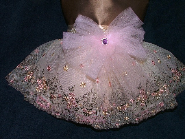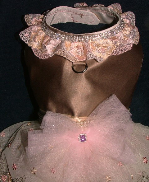 Designer Julie Lancaster designed this lovely dress/ harness using this a taupe colored bridal satin, The waist has a two inch gold ribbon that has very lovely pearl and rhinestone trim sewn on it. The neck is a lovely ivory and soft pink with pale peach flowers gathered trim and three row clear rhinestone trim on top of the lace at the neck. There is a pretty pink tulle bow at the waist with a pink glass stone, circled by rhinestones to adorn the bow. The boarder is hearts and flowers in shades of pink and silver. The skirt has a total of five layers, from satin to tulle’. The bodice is completely lined and interfaced to keep its shape. This dress is remarkable and is what she calls a portrait dress but can be used for parties and more because like all of Julie’s outfits, she designs them with D-ring so you can keep you beloved pet on a leash. It is measured in a size Large for the TOY Breed dog. It has heavy duty Velcro at the neck and at the chest. It is 18-19 inch around the chest. The neck measures 14 inches. From back on neck to tail bone, it is 13inches long. We pride ourselves on the workmanship of our product and guarantee it is well made. You will not find anything else on the market like it because it is a ONE OF A KIND and designed by Julie Lancaster of Off the Cuff Stuff for Pets. We ask that you measure you dog before you order from us because we do not offer returns on our clothing line due to health regulation. Make sure the measurements are ONE inch smaller then what is listed here.