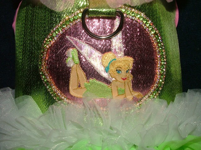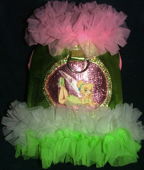 What a precious harness vest. This is a Tinker Bell inspired harness. It is designed with LIME GREEN Lame’ with a PINK lame’ cameo center, with Tink inside it. There is green and clear rhinestones hand sewn on the edge of the cameo. The neck has six ruffles of PINK non fray chiffon and the bottom has many layers of white and lime green non fray chiffon fabric. It is fully lined with a green satin fabric so it is ultra soft next to the dog’s body and is bound with pink bias tape. It is measured in a size medium for the TOY Breed dog. It has heavy duty Velcro at the neck and at the chest. It has a metal D-Ring loop so you can use it with your leash. It has a 18-19 inch chest, and an 13 inch neck. From back of neck to tail bone, it is 9 inches long.. The inside is interfaced, to help keep its shape. We pride ourselves on the workmanship of our products and guarantee quality. You will not find anything else on the market like it because it is a ONE OF A KIND and designed by Julie Lancaster of Off the Cuff Stuff for Pets. We ask that you measure your dog before you order from us because we do not offer returns on our clothing line due to health regulations. Make sure the measurements are ONE inch smaller than what is listed here. Please feel free to LIKE us on Face book where you will see our nearly daily listings of new items.