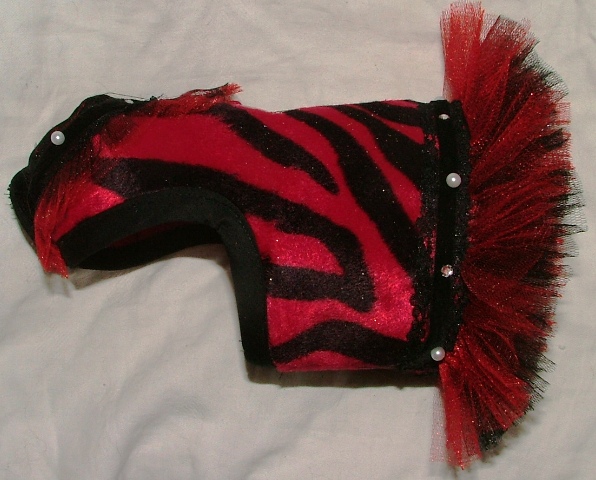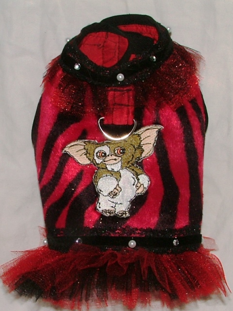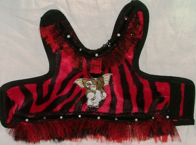 Red tiger faux fur and the Gremlin.. what a design! Totally Off the CUFF Stuff. It has four rows of black and red shimmering tulle’ on the bottom and on the neck. It has black velvet ribbon with lace and pearls on top of the tulle’. It is fully lined with RED sheath lining and is bound with black bias tape. It is measured in a small for the TOY Breed dog. It has heavy duty Velcro at the neck and at the chest. It has a metal D-Ring loop so you can use it with your leash. It has 15-16 inch chest, and a 9 inch neck. From back of neck to tail bone, it is 8 inches long. The inside is interfaced, to help keep its shape. We pride ourselves on the workmanship of our products and guarantee quality. You will not find anything else on the market like it because it is a ONE OF A KIND and designed by Julie Lancaster of Off the Cuff Stuff for Pets. We ask that you measure your dog before you order from us because we do not offer returns on our clothing line due to health regulations. Make sure the measurements are ONE inch smaller than what is listed here. Please feel free to LIKE us on Face book where you will see our nearly daily listings of new items.