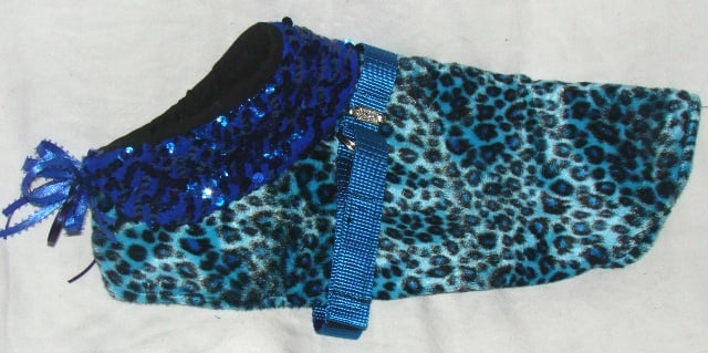 Here is one of the many coats Julie will be putting out this winter. It is fleeced lined in Black. The outside body is a spotted blue leopard print in a faux fur fabric. It has a royal blue sequin collar from recycled material. It is designed so the dogs head slips through the neck hole and it adjust by the belt around the waist. The belt is royal blue webbing and has two pretty double rhinestone ornaments. There is a pretty bow sewn in the front with a little ribbon blue square cut glass decoration in the center. There is a metal D-Ring on the belt to make it adjustable and Velcro to help keep it from slipping. It has 17inches chest, and a 14 inch neck. From back of neck to tail bone, it is 12 inches long. We pride ourselves on the workmanship of our products and guarantee quality. You will not find anything else on the market like it because it is a ONE OF A KIND and designed by Julie Lancaster of Off the Cuff Stuff for Pets. We ask that you measure your dog before you order from us because we do not offer returns on our clothing line due to health regulations. Make sure the measurements are ONE inch smaller than what is listed here. Please feel free to LIKE us on Face book where you will see our nearly daily listings of new items.
