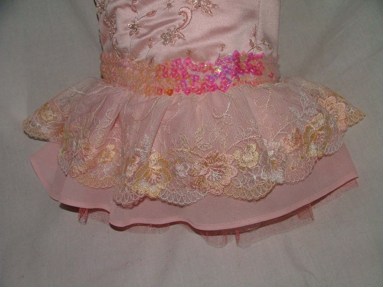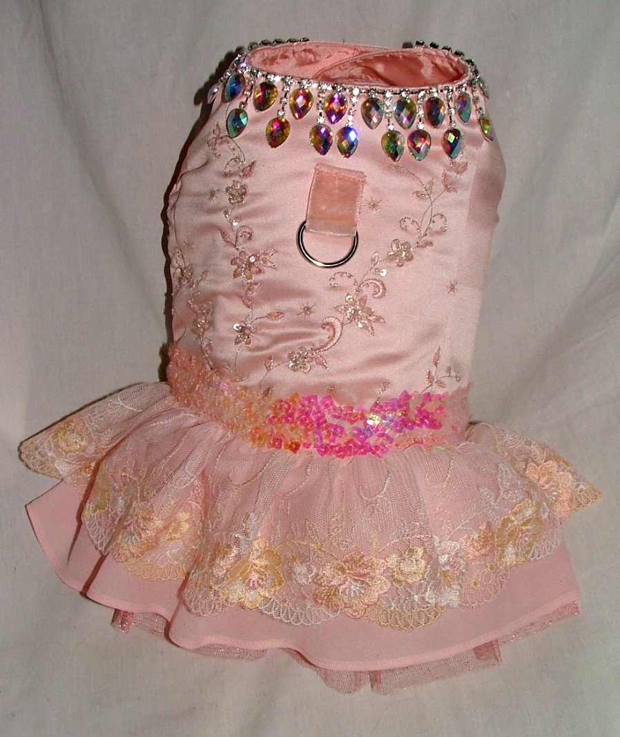 Here is a very lovely Portrait dress for your sweet poochy! This dress is made from recycled material. It is a pale pink bridal satin. It has a lovely bead work on the front, sequin waist, border print ruffle and underskirt but mostly it has those drop dread teardrop multi colored rhinestones. It is fully lined with sheath lining and it is ultra soft next to the dog’s body and like all of my dresses and vest harnesses, it is interfaced to keep the shape. This dress has a metal D-ring so it can be used as a harness. It measures a size Medium for the toy breed. The neck measures 12 inches and the waist measures 17-18 inches. From the back of the neck to the bottom of the dress it measures,11 inches. We pride ourselves on the workmanship of our products and guarantee quality. You will not find anything else on the market like it because it is a ONE OF A KIND and designed by Julie Lancaster of Off the Cuff Stuff for Pets. We ask that you measure your dog before you order from us because we do not offer returns on our clothing line due to health regulations. Make sure the measurements are ONE inch smaller than what is listed here. Please feel free to LIKE us on Face book where you will see our nearly daily listings of new items.